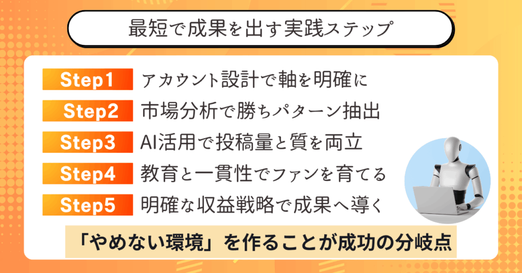 具体的には、コンセプト設計や投稿の型、AIを活用した効率化といった「再現性のある仕組み」を持つことで、誰でも成果を安定して出せるようになります。