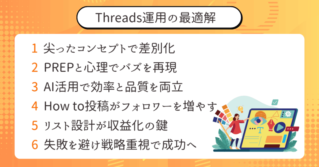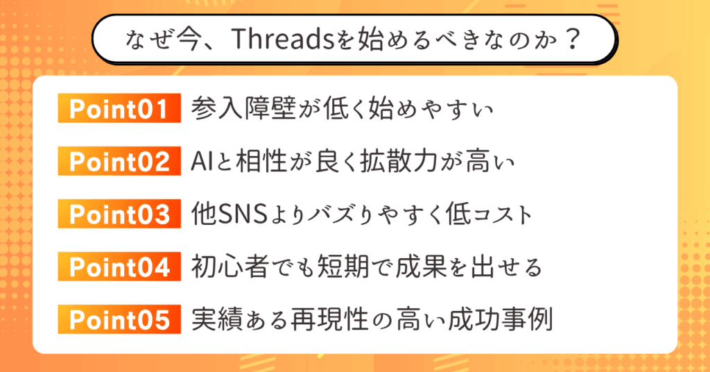 まとめると、Threadsは競合が少ない市場とAI活用のしやすさによって、初心者でも結果を出せる環境が揃っているといえます。
