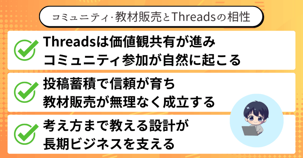 Threadsと教材・講座販売の相性が良い理由は、〝売ろうとしなくても売れていく流れ〟を作りやすい点にあります。
