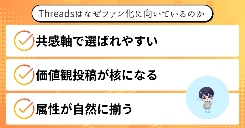 さらにThreadsは、同じ属性や価値観を持つ人が自然と集まりやすい設計になっています。