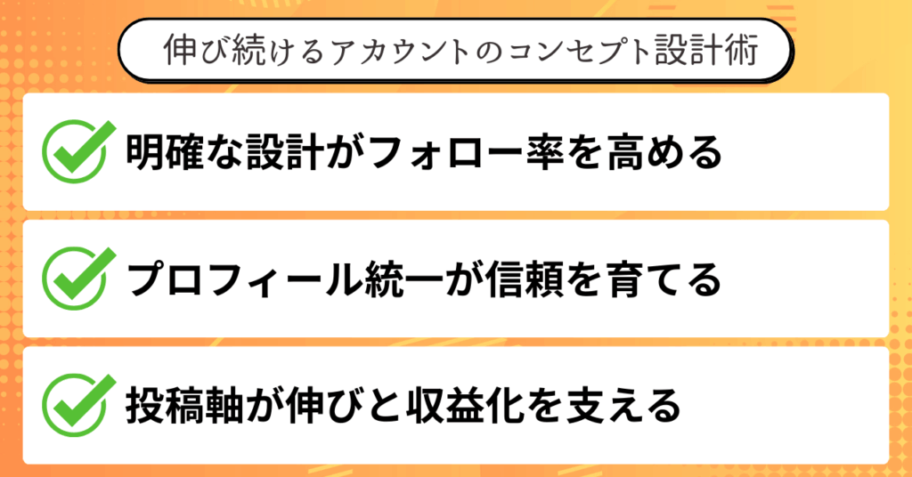 逆に、コンセプトが明確であれば、プロフィールや固定ポストを見ただけで読者が信頼してくれ、自然とフォロー率が上がっていきます。