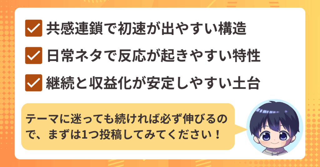 共感性の高いテーマが多いため、特別な専門知識がなくてもバズを起こしやすく、投稿を継続するほど成長が加速します。