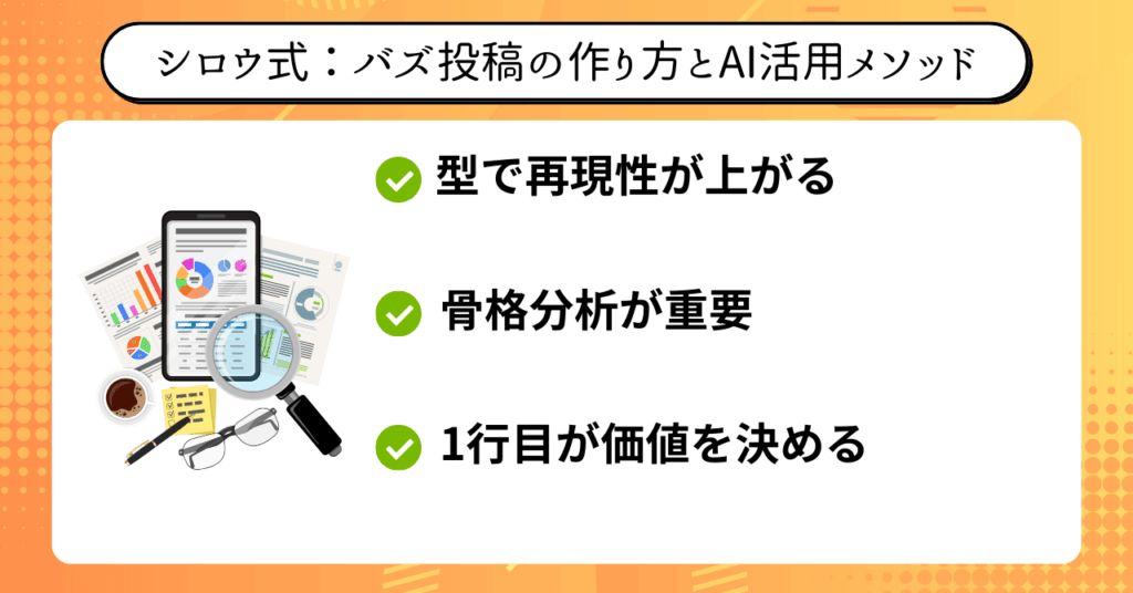 また、伸びる投稿には必ず一定の型があり、シロウさんが実践している〝ネタ→1行目の主張→本文構築〟という流れは再現性の高い方法です。