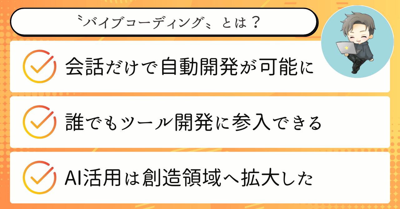 バイブコーディングとは、AIがコードを自動生成し、ユーザーの自然な指示をもとに仕組みを構築する技術です。