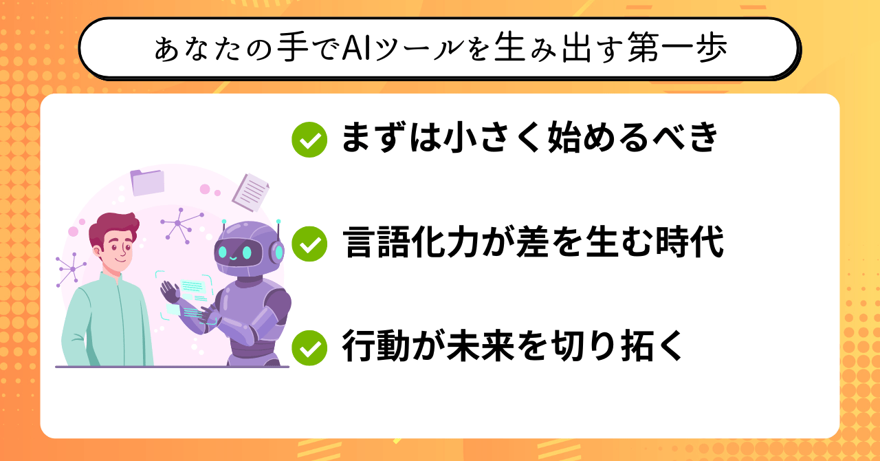 一度で完成させようとせず、小さなツールから始めることで改善サイクルを回せるようになります。