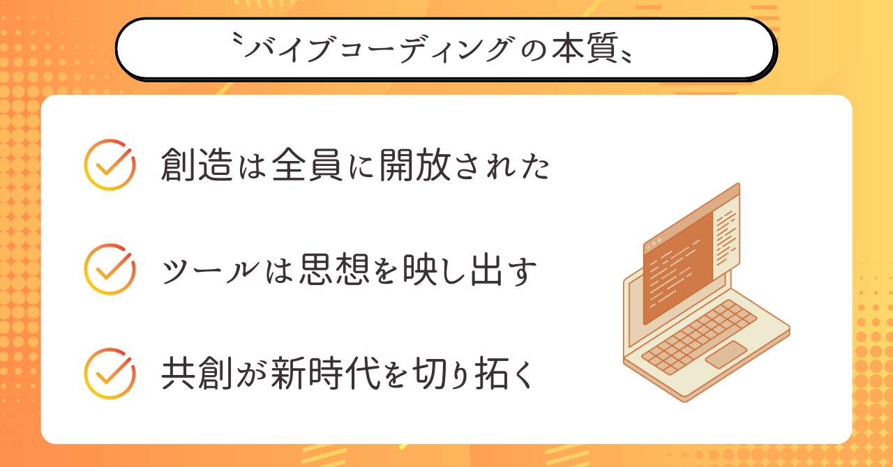 バイブコーディングは、「誰かに作ってもらう時代」から「自分で創る時代」への転換を象徴しています。
