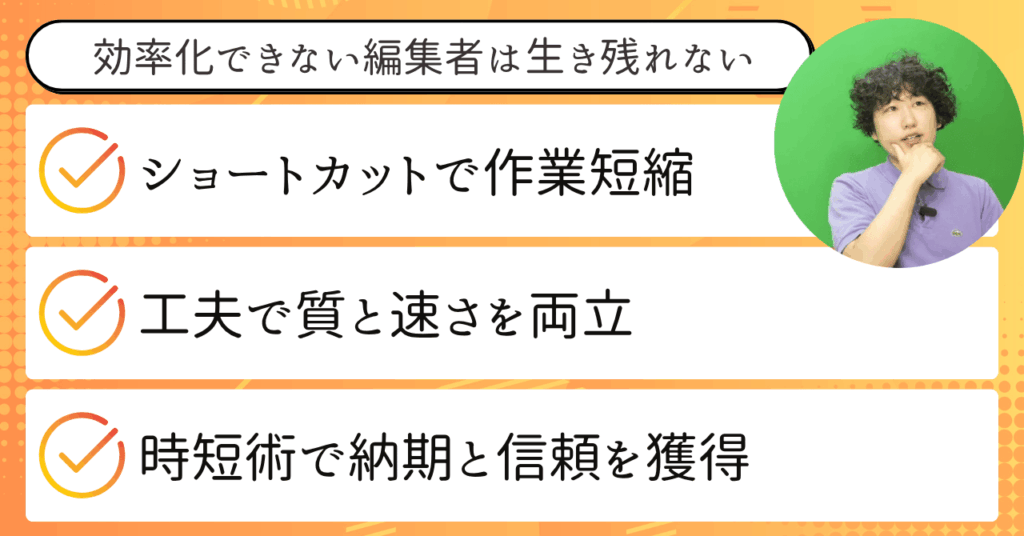 つまり、動画編集者として成長するためには、効率化と需要理解を同時に意識した学習が欠かせないのです。