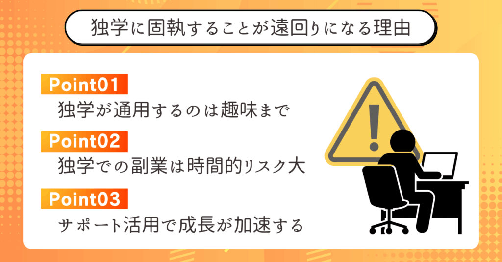 独学だけに頼ると、学習効率が低下しやすく、誤った方法に気づけないまま時間を浪費してしまいます。
