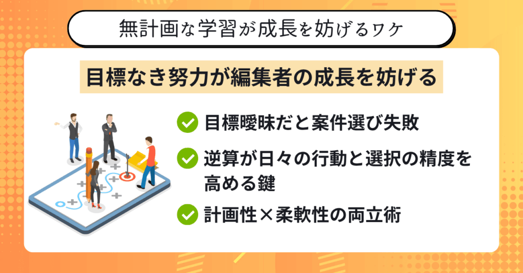 インプットに偏った学習や、計画性の欠如、効率化を軽視した取り組みは、成長を大きく妨げる要因になります。