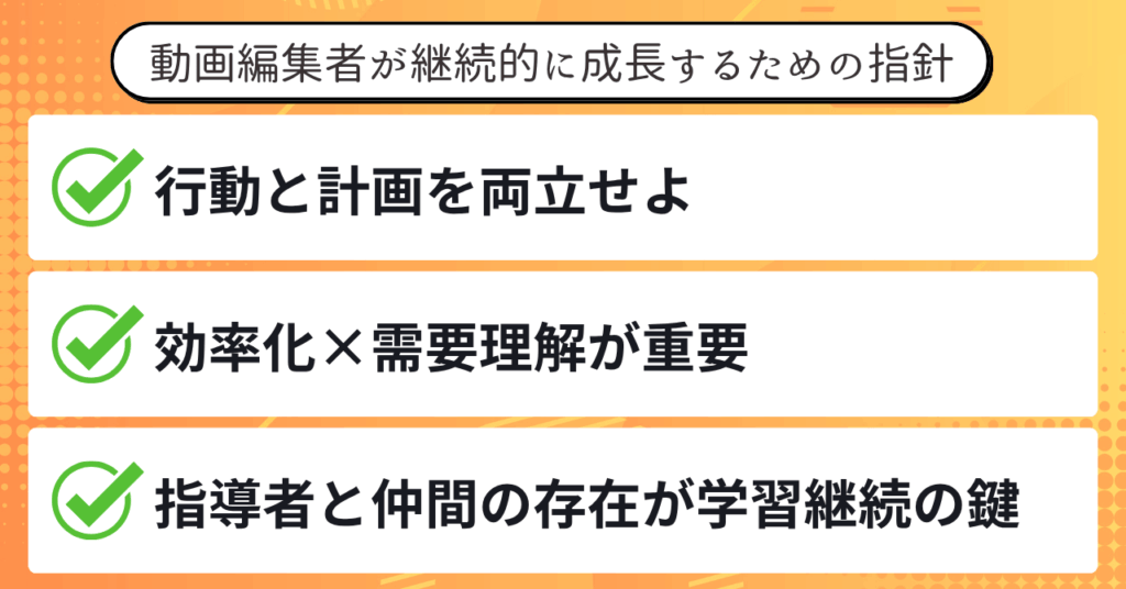 動画編集者が継続的に成長していくためには、効率化と需要の両方を意識した学習が欠かせません。