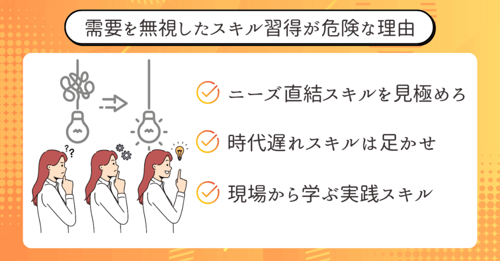 需要が低いスキルに時間をかけるよりも、今まさに案件で求められているスキルを優先的に学ぶほうが、はるかに効率的です。