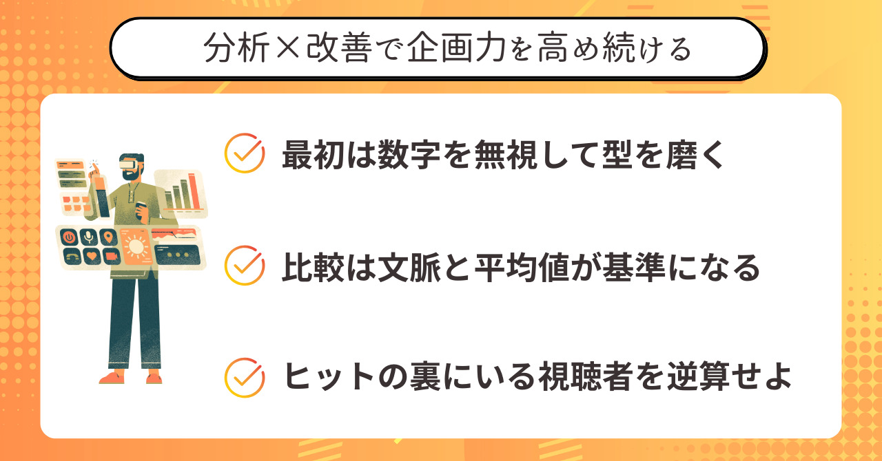 ここまで、YouTube企画を論理的に組み立て、改善し続けるための具体的な思考法と手法を解説してきました。
