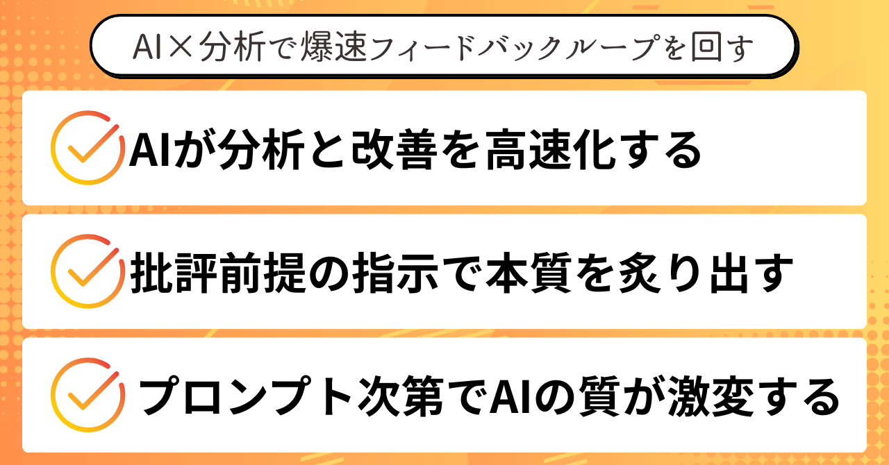 構造設計、コメント分析、AI活用による差分抽出、再現性のある改善ループ、横展開の精度