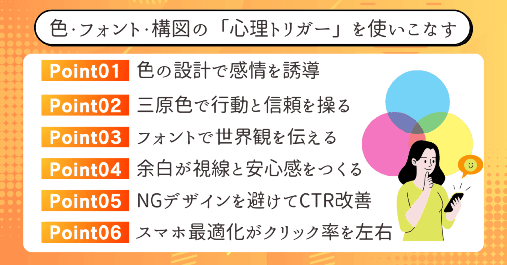 - 色や構図の心理効果を意識して視線を誘導する
