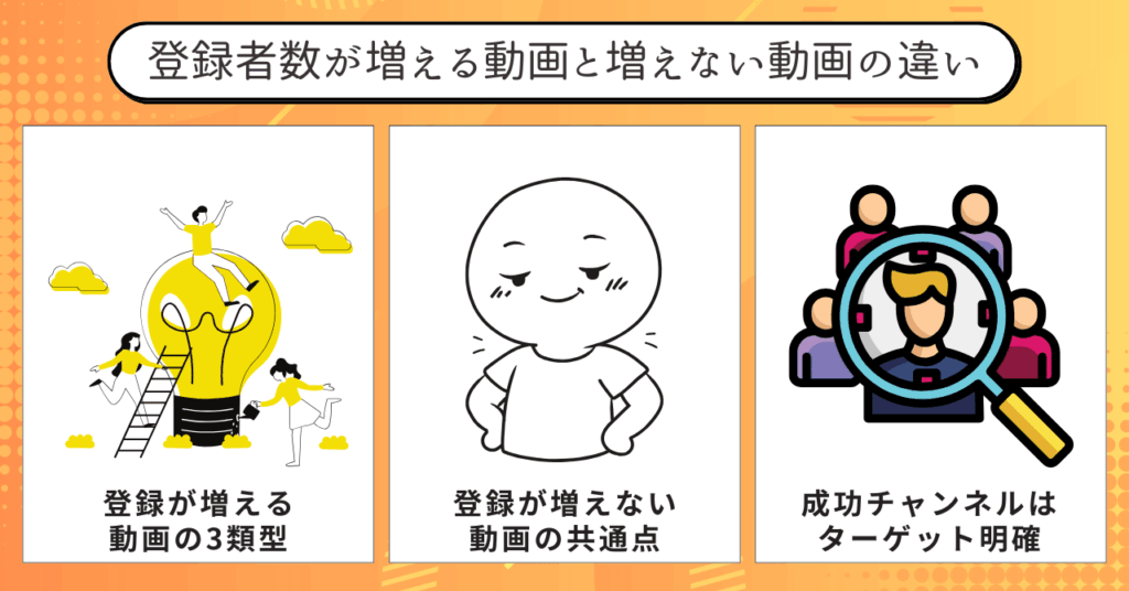- 登録者が増える動画には「悩み解決・長尺・明確ターゲット」という共通点がある