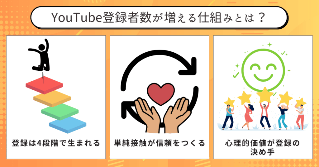- 登録者が増える流れは「動画発見 → クリック → 視聴 → 登録」のシンプルなプロセス