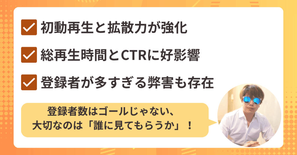 - 登録者数が多いことは初動再生数や拡散力に直結するが、デメリットもある