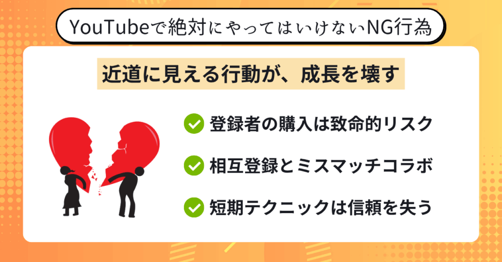 - NG行為はチャンネルを壊すリスクが高いため、絶対に避けるべき