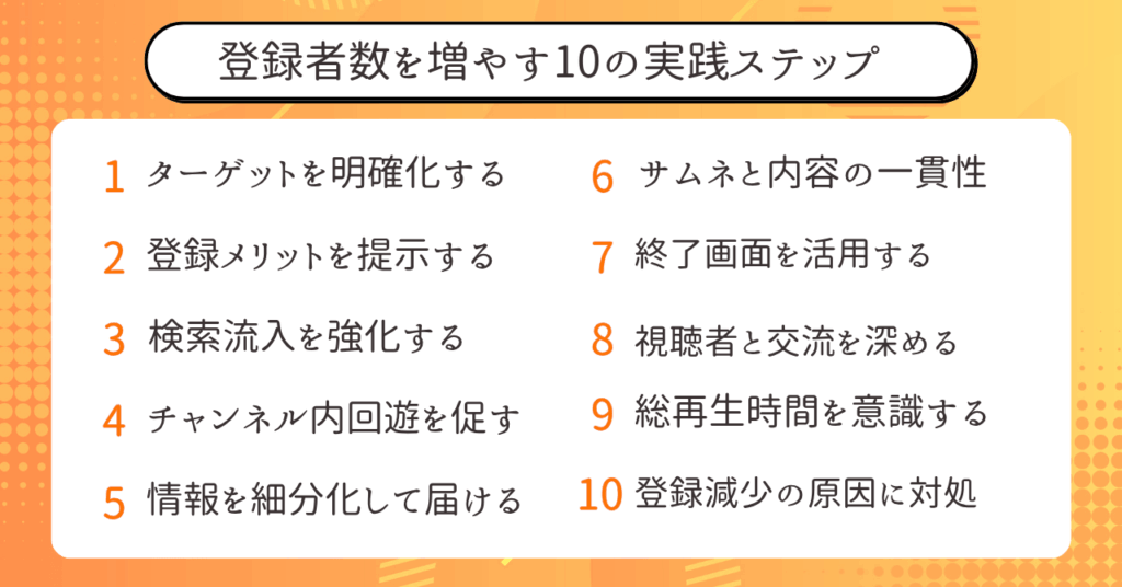- 10の実践ステップを徹底することで効率よく登録者を増やせる