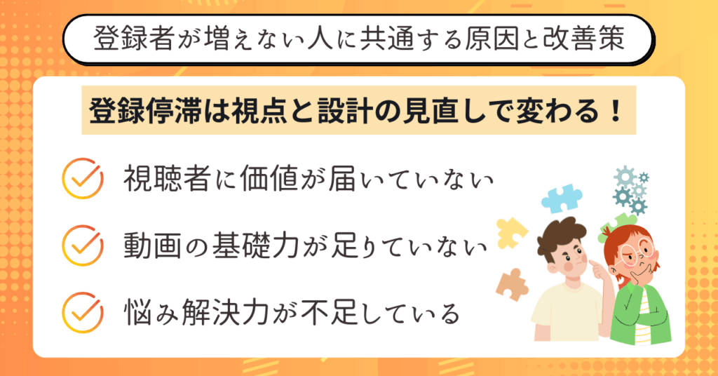 - 登録者が増えない原因は「価値不足・基礎不足・動画選定ミス」に集約される